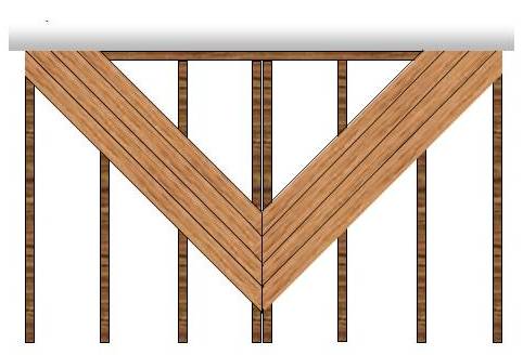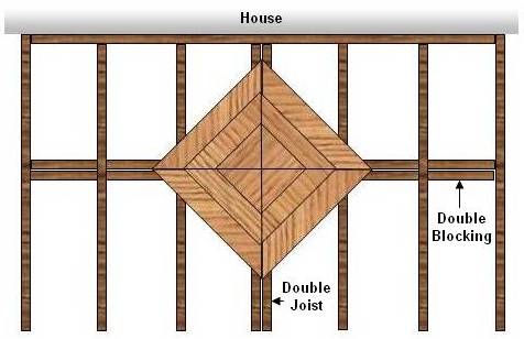 You can install your flooring deck material in a variety of patterns and designs (Figure 1 shows a complex deck flooring design / pattern). Most deck pattern and design variations require that the support frame be modified to accommodate the pattern or design. Because of these potential modifications you should decide on a deck flooring pattern and designs before you start designing the structural (frame) members of your deck.